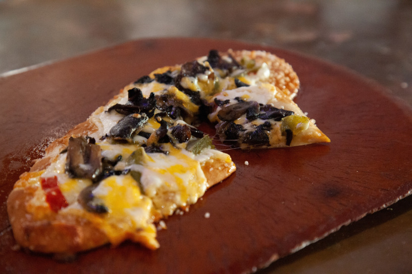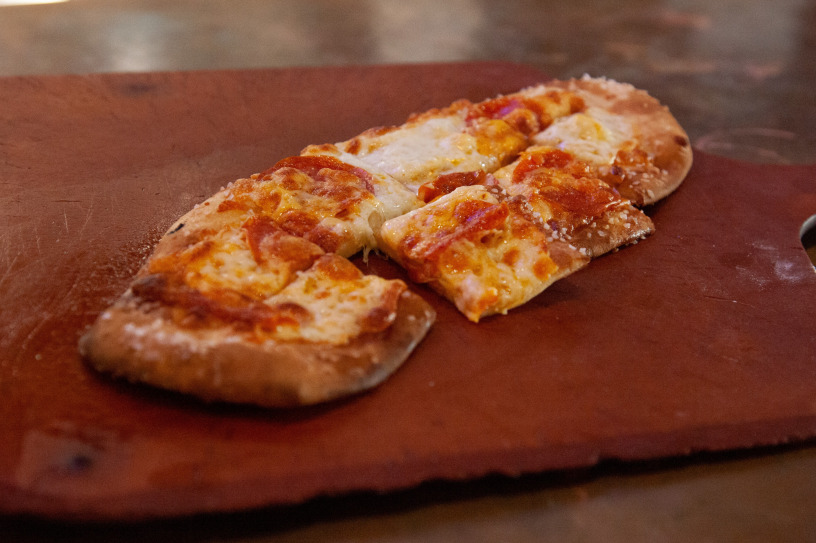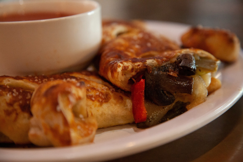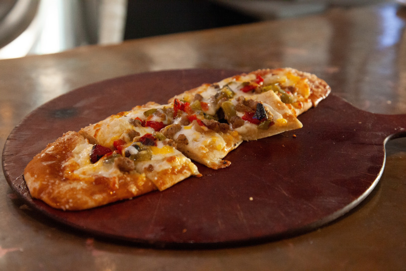 Our blend of cheeses, sausage, peppers, onions, baked onto a fresh pretzel flatbread